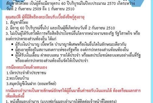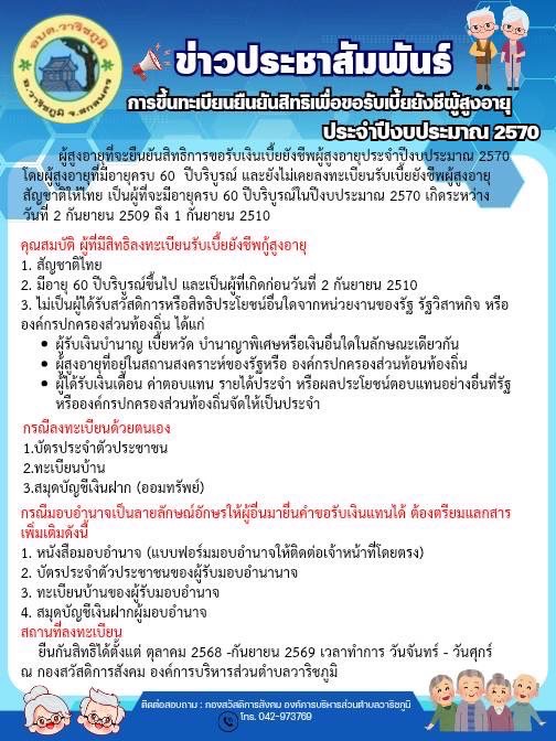 Posted in ข่าวประชาสัมพันธ์ การขึ้นทะเบียนยืนยันสิทธิเพื่อขอรับเบี้ยยังชีผู้สูงอายุ ประจำปึงบประมาณ 2570 admin