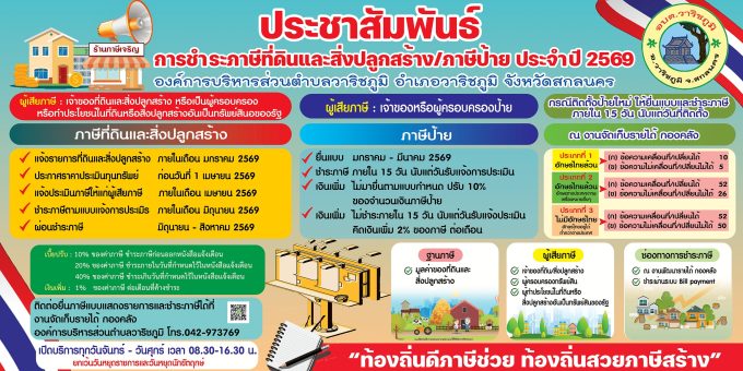 ประชาสัมพันธ์ขั้นตอนการจัดเก็บภาษีที่ดินและสิ่งปลูกสร้าง ภาษีป้าย ประจำปี พ.ศ. 2569